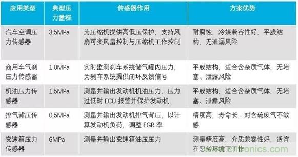 汽車領(lǐng)域陶瓷電容壓力傳感器典型應用如下表所示: