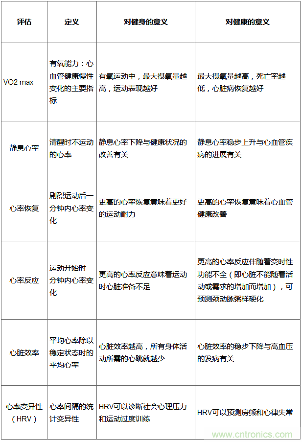 【導(dǎo)讀】在日益數(shù)字化的世界中,光學(xué)心率傳感器在可穿戴設(shè)備中的應(yīng)用越來越廣泛。這些設(shè)備中數(shù)不清的應(yīng)用可提供從個人活動、健身水平到健康狀況的所有內(nèi)容。精準(zhǔn)的生物識別傳感器數(shù)據(jù)可以提供準(zhǔn)確的健身/健康評估,但設(shè)計師和工程師究竟能用這些評估做些什么呢?表1總結(jié)了目前在健身應(yīng)用中使用的一些常見評估,這些評估也證明了健康醫(yī)療的意義。