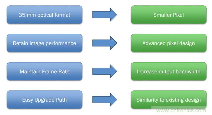 為了在保留35 mm光學格式的同時,將器件(例如KAI-29050)的分辨率從現(xiàn)有的2900萬像素繼續(xù)提升,就需要更小的像素格式,以便將更多像素放置于給定區(qū)域中。但為同時保留這一較小像素中的關(guān)鍵成像參數(shù),如圖像均勻性、動態(tài)范圍和底噪,除了簡單地縮小尺寸外,還需要提升像素設(shè)計。
