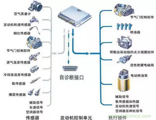 汽車電子控制系統(tǒng)有傳感器、電子控制器(ECU)和執(zhí)行器的組成。在汽車電子控制系統(tǒng)中,傳感器的作用是將被控對象的相關參量轉換為相應的電信號,并輸送給控制器,控制器根據相關傳感器的信號對被控對象的工況及狀態(tài)進行分析與判斷后,輸出控制信號,通過執(zhí)行器實現自動控制。電子控制系統(tǒng)分為發(fā)動機電子控制系統(tǒng)、底盤電子控制系統(tǒng)和車身電子控制系統(tǒng)。
