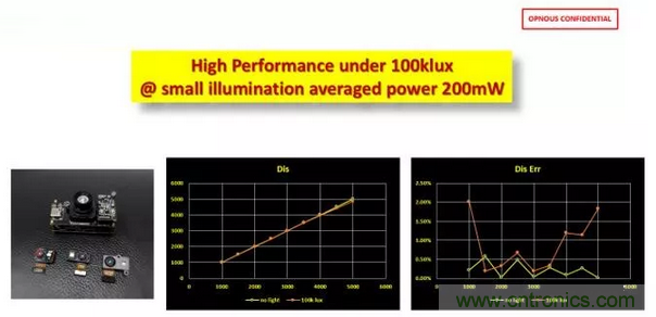 炬佑智能在ToF感知功能方面做了大量的開發(fā),劉洋先生在現(xiàn)場為大家展示了炬佑智能開發(fā)的3D ToF傳感芯片和模組的測試結(jié)果。經(jīng)過炬佑智能自己研發(fā)的智能算法校正后,ToF傳感器在不同背景光的反射率誤差從6%下降到1.4%以下;通過傳感器融合,940nm ToF傳感器在室外的探測精度達(dá)到5‰以下;在室外強(qiáng)光環(huán)境下,通過動(dòng)態(tài)算法的提升,在100klux、照明平均功耗在200mW的水平下,3D ToF傳感模組表現(xiàn)出非常優(yōu)秀的性能。