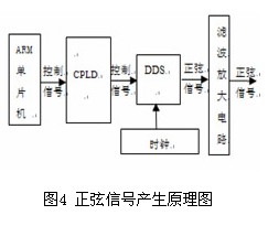 采用DDS技術(shù)在當(dāng)前的測試測量行業(yè)已是一種主流的做法,其頻率精度可隨相位累加器的位數(shù)而定。本系統(tǒng)采用單片機+專用DDS芯片的方式產(chǎn)生正弦信號,其原理如圖4所示,ARM單片機向CPLD 發(fā)出控制命令,CPLD 在時鐘下譯碼后產(chǎn)生DDS的控制信號,產(chǎn)生出相應(yīng)頻率的正弦波信號,該正弦信號經(jīng)過濾波放大后,輸出相應(yīng)幅值的正弦信號。