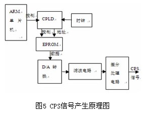 曲軸位置信號(CPS)是PCM控制點火系統(tǒng)中最主要的傳感器信號,為適應(yīng)多種PCM的需求,設(shè)計采用CPLD和DA的方式產(chǎn)生。CPS信號產(chǎn)生原理如圖5所示,在EPROM中存有一個周期的正弦表數(shù)據(jù),當(dāng)需要產(chǎn)生 CPS信號時,ARM單片機對CPLD進(jìn)行設(shè)置,CPLD根據(jù)接收的控制命令,通過時鐘計數(shù),產(chǎn)生讀存儲器的信號,并向EPROM提供合適的地址信號和控制信號,EPROM輸出相應(yīng)地址的數(shù)據(jù),經(jīng)D/A轉(zhuǎn)換,變成單端CPS模擬信號,然后經(jīng)濾波電路和單端轉(zhuǎn)差分處理電路,輸出CPS差分信號。在實際的電路實現(xiàn)中,對CPS信號的控制可由計算機通過CAN總線向ARM發(fā)出控制命令進(jìn)行設(shè)置,因此,即使ARM芯片在運行過程中復(fù)位,電路仍能輸出正確的CPS信號,以確保測試周期的正常進(jìn)行。