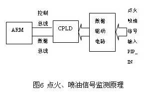 點火和噴油信號是汽車發(fā)動機中的關(guān)鍵信號,其周期和時序直接關(guān)系到汽車的運行狀態(tài),因此監(jiān)測它們的周期和時序尤為重要。本系統(tǒng)監(jiān)測原理圖如圖6 所示,對于點火信號的監(jiān)測,主要是監(jiān)測它與CPS信號的同步,以及兩個或四個點火信號之間的時序關(guān)系。當(dāng)CPLD尋找到點火信號與CPS同步的起始點后,根據(jù)輸入的PIP_IN信號,對各點火信號進(jìn)行計數(shù)。每當(dāng)一個點火周期完成后,在下一個點火周期向ARM 單片機產(chǎn)生一個中斷信號。該中斷信號觸發(fā)ARM 單片機進(jìn)入中斷處理程序,在該中斷程序中,ARM單片機讀入對各點火信號的計數(shù)值,判斷點火信號的時序和周期,并設(shè)置點火信號正常與否的標(biāo)志。對于噴油信號的監(jiān)測,主要是監(jiān)測它與CPS信號的同步,以及它們之間的時序關(guān)系。當(dāng)PIP_IN信號中四個噴油信號中任何一個信號的下降沿到來時,CPLD都會監(jiān)測其它三個噴油信號的狀態(tài),如果其它三個噴油信號的狀態(tài)正常,即給出噴油信號正常標(biāo)志,反之給出噴油信號異常標(biāo)志。