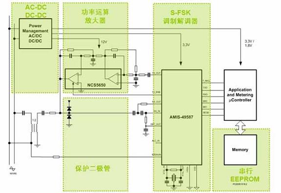 此外,AMIS-49587采用S-FSK調制技術,結合高分辨率的濾波算法,配以自動可信值/中繼器(repeater)功能,提供基于長距離電力線的 高可靠性數(shù)據(jù)通信。通信誤差比其它可選及現(xiàn)有方案更低。這器件藉板載低抖動鎖相環(huán)(PLL)與交流主電源(mains)信號同步。由于包含16位分辨率的 模擬前端,使器件具有極優(yōu)的噪聲免疫性和極高的接收靈敏度。