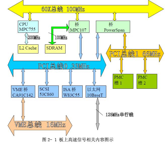 我們?cè)O(shè)計(jì)的是基于PowerPC的主板,主要由處理器MPC755、北橋MPC107、北橋PowerSpanII、VME橋CA91C142B等一些電路組成,上面的高速信號(hào)如圖2-1所示。